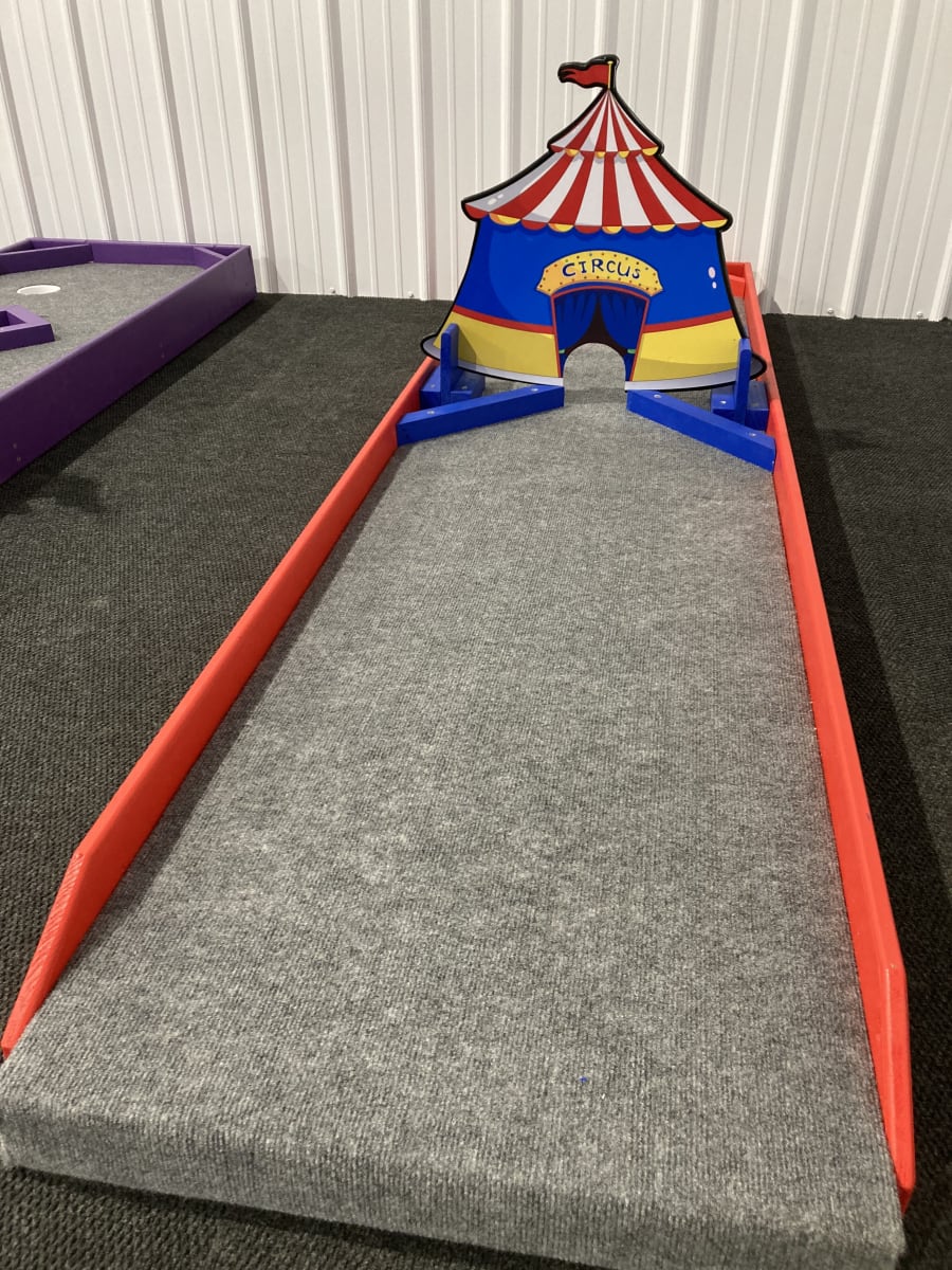 The Big Top themed portable mini golf pad is fun for all ages. This popular game is also known as putt putt, miniature golf and goofy golf. Line up the ball, putt down the green through the circus tent and get a hole in one! You can rent this as a stand alone item or add it to your inflatable rental. You can also rent the entire 9 hole course if you wish.